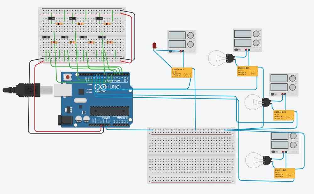 在經過一連串的討論之後,我們把需求簡化成 7 個輸入控制繼電器開關 4 組燈(靶燈、場燈…共四種),分別為