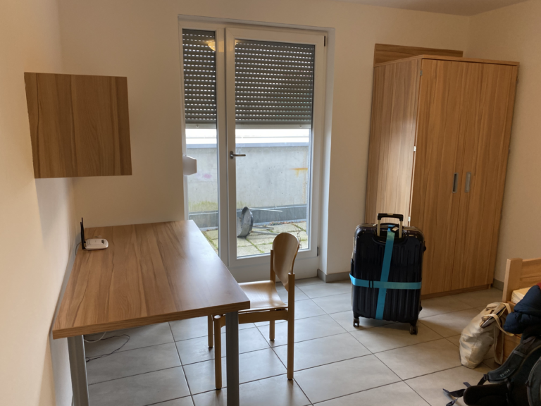 學生宿舍不是由學校擁有,而是由 Studierendenwerk 分配給在 DA 裡面三所大學。在申請時學校會協助申請學生宿舍,我所知的國際生都有宿舍。學生宿舍為單人房,共享衛浴、廚房和陽台。室友是隨機的,筆者的室友是兩位德國人。每月房租大約為 400~450 歐元,最後一個月的房租會由學校吸收,等於免費住最後一個月。