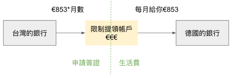 - 限制提領帳戶:申請簽證的時候需要財力證明,證明你在交換期間不會因為缺錢而餓死。要取得這個證明,必須先開立一個限制提領帳戶,並將一定金額(€853 * 停留月數)的歐元匯入。